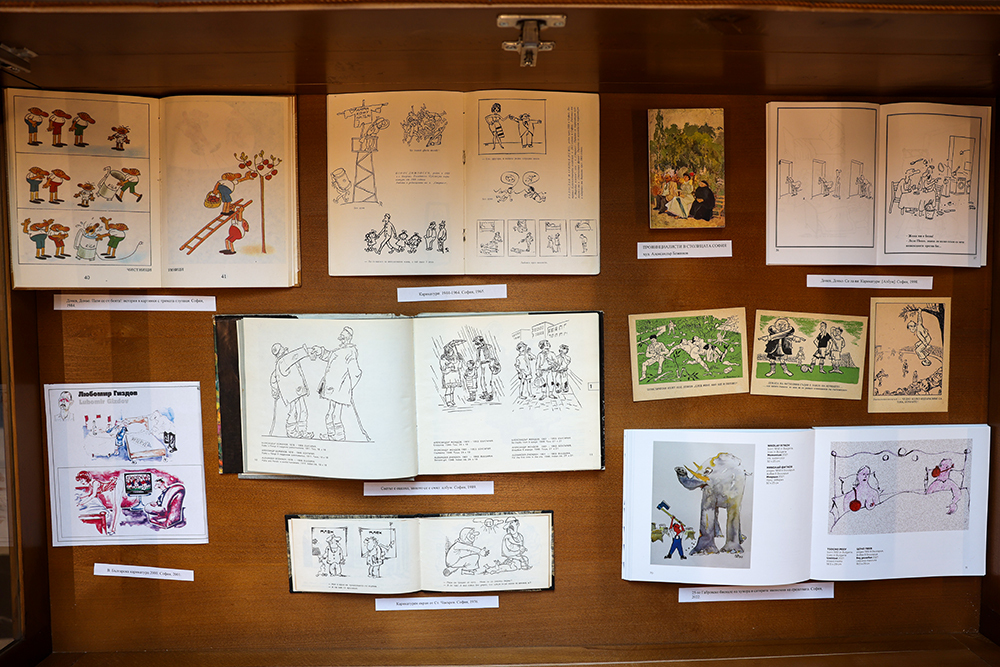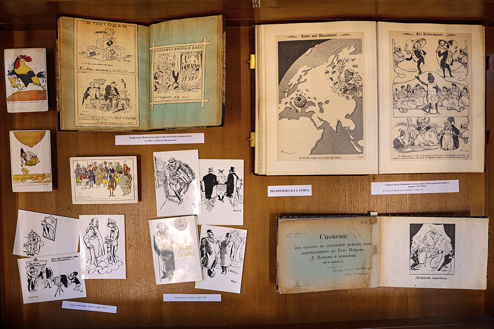 Експозицията е организирана от отдел „Специални колекции“ и представя богато подбрани материали от фонда на читалня „Картографски и графични издания“ – албуми, пощенски картички, репродукции и оригинални карикатурни рисунки. Чрез тях се проследява развитието на българската карикатура като специфичен художествен жанр и важен израз на обществените нагласи.
