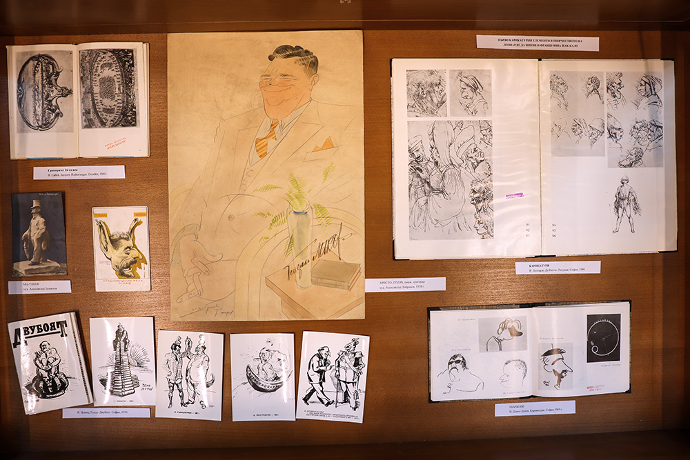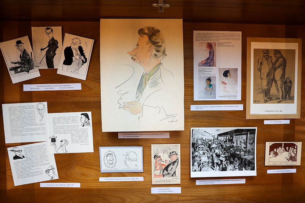 Особен интерес в изложбата представляват двете оригинални произведения на Александър Добринов, които представляват ценни образци на българската карикатурна традиция: „Христо Луков“ – карикатура с графит и акварел от 1938 г. и „Петър Морозов“ – шарж с молив и акварел върху картон от 1943 г.